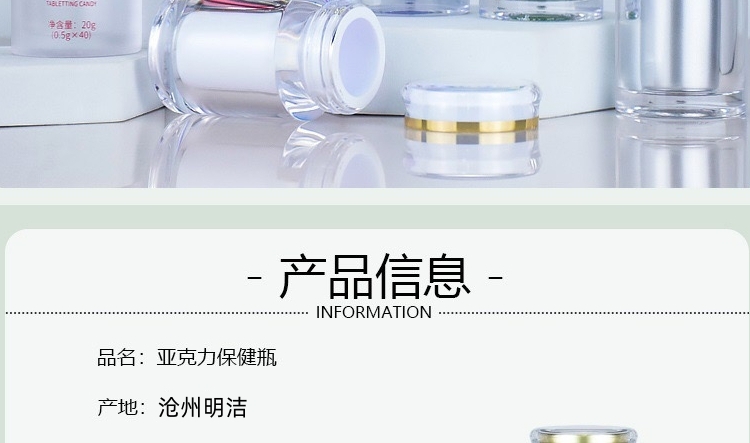 滄州明潔生產銷售含片包裝瓶,30ml保健品瓶,膠囊瓶,150ml保健品瓶,內膽亞克力瓶,軟膠囊瓶,亞克力瓶,壓片糖果瓶,保健品塑料瓶,中藥丸瓶,避光塑料瓶,ps保健品瓶,固體片劑瓶,塑料藥瓶,產品規格多,外觀新穎,彰顯大氣。