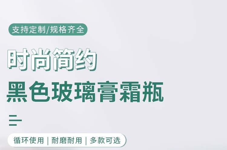 滄州明潔專注于黑色膏霜瓶,面膜分裝瓶,護膚瓶,眼霜瓶,面膜瓶,化妝品分裝瓶、精華液瓶、香水瓶、乳液瓶、膏霜瓶、眼霜瓶、面霜瓶、香薰瓶、面膜瓶、護膚瓶,黑色玻璃膏霜瓶,滴管瓶等,提供蒙砂、真空電鍍、噴涂、絲印、高溫、燙金燙銀等加工服務。