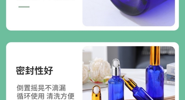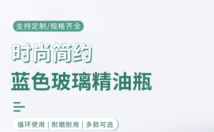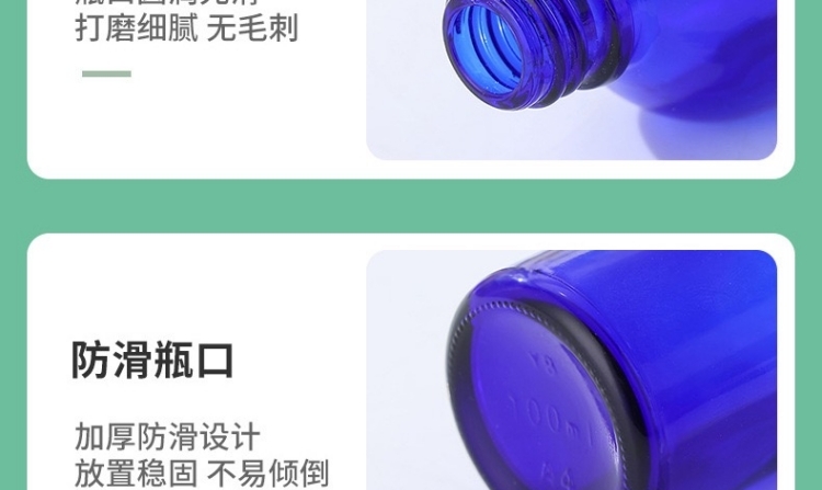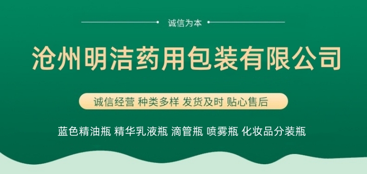 滄州明潔專注于藍色精油瓶,乳液瓶、滴管噴霧瓶、化妝品分裝瓶、精華液瓶、香水瓶、走珠瓶、膏霜瓶、眼霜瓶、面霜瓶、香薰瓶、面膜瓶、滴管瓶等,提供蒙砂、真空電鍍、噴涂、絲印、高溫、燙金燙銀等加工服務。