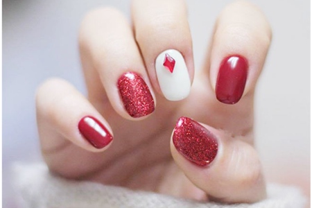 紅色本來_華麗閃亮,加上閃片的點(diǎn)綴變得更加艷麗。選擇自帶細(xì)微珠光的大紅色,均勻涂抹在指甲上兩次,閃片和光面間隔。乳白色玉面甲油涂在中間的指甲上,做好保護(hù)層后黏貼一顆棱形寶石。