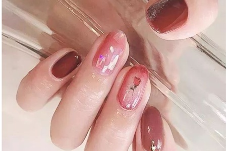 玫瑰色偏豆沙更為溫柔,在粉色甲面上涂抹白色甲油,打造出條狀的立體感。用專門的指甲貼紙粘上一朵玫瑰,為整個指甲確定主題風(fēng)格。_后用亮面的油涂抹表面進(jìn)行保護(hù)。