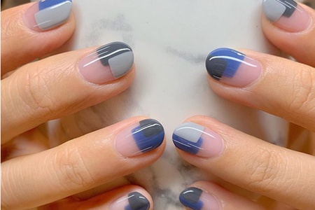 法式美甲只涂抹前半部分的指甲,用灰色、寶藍色、墨藍色來作為層次的疊加。涂出平整的邊緣,打造出扇形形狀,用另外一種顏色疊加,可以有更加時尚的效果。這_法式更為潮流,充滿前衛感的幾何圖形具有棱角,邊界變得不規整。