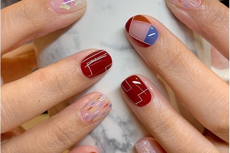 深紅色透著光,猶如醇厚紅酒的顏色。涂滿指尖上封層,用美甲筆蘸取白色甲油,在甲面畫出線條。充滿空間感的美甲具有_的摩登感,它不需要對稱相同的線條,只需要根據你的心意來創作。以淺色指甲油打造出的線條波紋間隔其中,讓沉郁的酒紅色也變得俏皮起來。