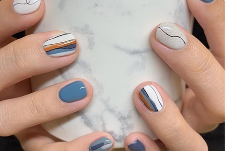 具有北歐性冷淡風的美甲_耐看,用色低調,莫蘭蒂成為主色調,顏色搭配讓人感覺到舒服。彎曲的線條打造簡潔的審美,在白藍色中以一抹亮眼橘色調動活力。曲線可以打造出多種造型,在兩側增加方形,在中間纏繞上小結。磨砂質感的灰色小點甲油,如同大理石的質感,為指甲增添上北歐風情。