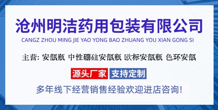 滄州明潔專注于歐標安瓿瓶,曲頸易折安瓿瓶,水針安瓿瓶,中性硼硅安瓿瓶,棕色安瓿瓶,琥珀色安瓿瓶,茶色安瓿瓶,易折安瓶,色環刻痕安瓿瓶、印字安瓿瓶,玻璃安瓿,注射劑瓶,曲頸安瓿,用心選材,質量可靠。